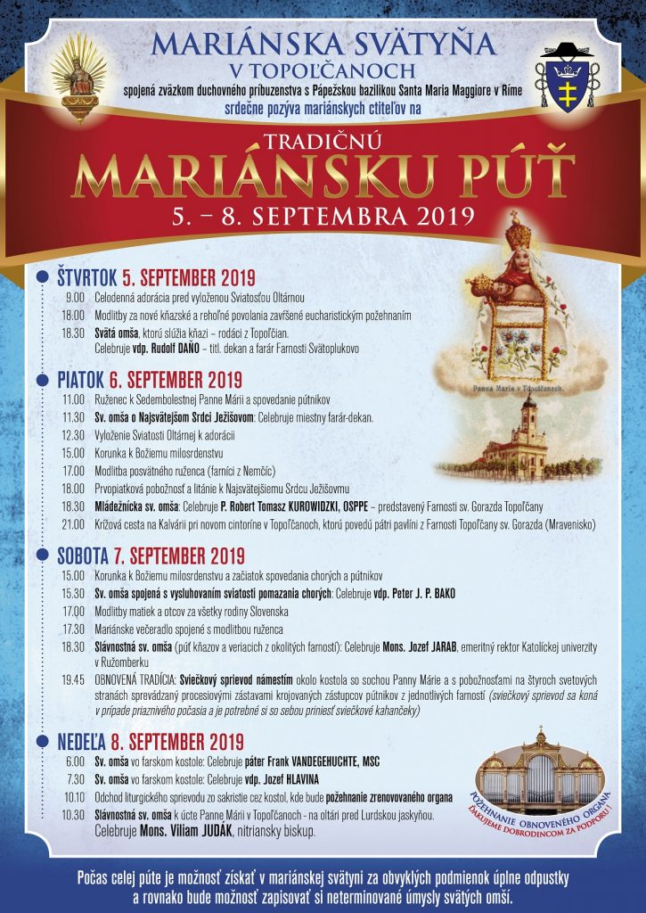 V Topoľčanoch sa v dňoch 5. – 8. septembra 2019 uskutoční tradičná Mariánska púť. Rímskokatolícky farský úrad pozýva pútnikov k účasti na liturgických sláveniach a duchovnom programe, ktorého súčasťou bude aj obnovená tradícia sviečkového sprievodu po Námestí M.R. Štefánika. Na základe duchovných zväzkov Mariánskej svätyne – Kostola Nanebovzatia Panny Márie v Topoľčanoch s pápežskou bazilikou Santa Maria Maggiore v Ríme je možné získať pri návšteve svätyne za obvyklých podmienok úplné odpustky. Hlavným celebrantom slávnostnej sv. omše k úcte k Panne Márii pred Lurdskou jaskyňou v nedeľu 8. septembra 2019 o 10,30 hod bude nitriansky diecézny biskup Mons. Viliam Judák.