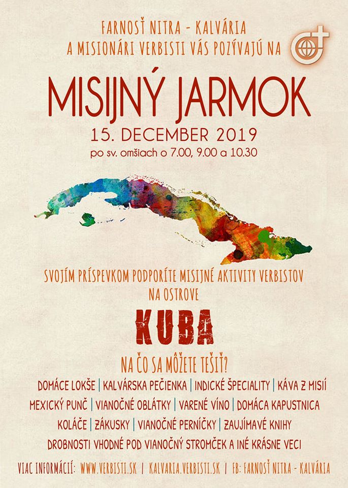 Misionári Spoločnosti Božieho Slova pozývajú na Misijný jarmok do Nitry na Kalváriu. Misijný jarmok je jedinečná príležitosť ako podporiť misie (konkrétne misie na Kube), a súčasne zažiť príjemnú rodinnú atmosféru. Jarmok sa koná 15. decembra 2015 po svätých omšiach o 7.00, 9.00 a 10.30 hod. Všetci sú srdečne pozvaní.