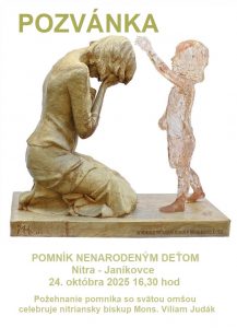 RKFÚ Nitra – Janíkovce pozýva  na slávnostný akt požehnania nového  Pomníka nenarodeným  deťom, ktoré sa uskutoční 24. októbra  2025  o  16,30 hod vo farnosti  Nitra – Janíkovce. Nový pomník pred  farskou budovou požehná nitriansky biskup  Mons. Viliam Judák. Po  požehnaní pomníka o  17,00 hod. bude biskup Viliam celebrovať  vo farskom  Kostole  sv. Petra a Pavla apoštolov sv. omšu. RKFÚ Nitra – Janíkovce pozýva veriacich mesta Nitra i všetkých ľudí dobrej vôle, aby opäť podporili OCHRANU každého ľudského života od jeho počatia až po prirodzenú smrť. Všetci sú srdečne pozvaní!