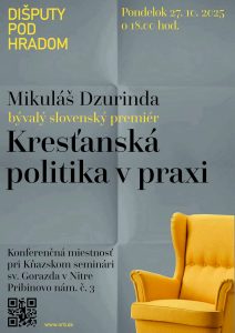 Nitrianske biskupstvo a Kňazský seminár sv. Gorazda v Nitre si Vás dovoľujú pozvať na diskusný večer pod názvom „Kresťanská politika v praxi“. S hosťom večera Mikulášom Dzurindom, bývalým predsedom vlády SR budeme diskutovať o kresťanskej politike. Zoznámime sa s jeho pohľadom na prepojenie viery a verejného života, jeho skúsenosťami z politiky i osobnými postrehmi. Dišputy pod hradom sa uskutočnia v pondelok 27. októbra 2025 o 18,00 hod. v konferenčnej miestnosti pri Kňazskom seminári sv. Gorazda v Nitre, na Pribinovom námestí č.3. Všetci sú srdečne pozvaní!