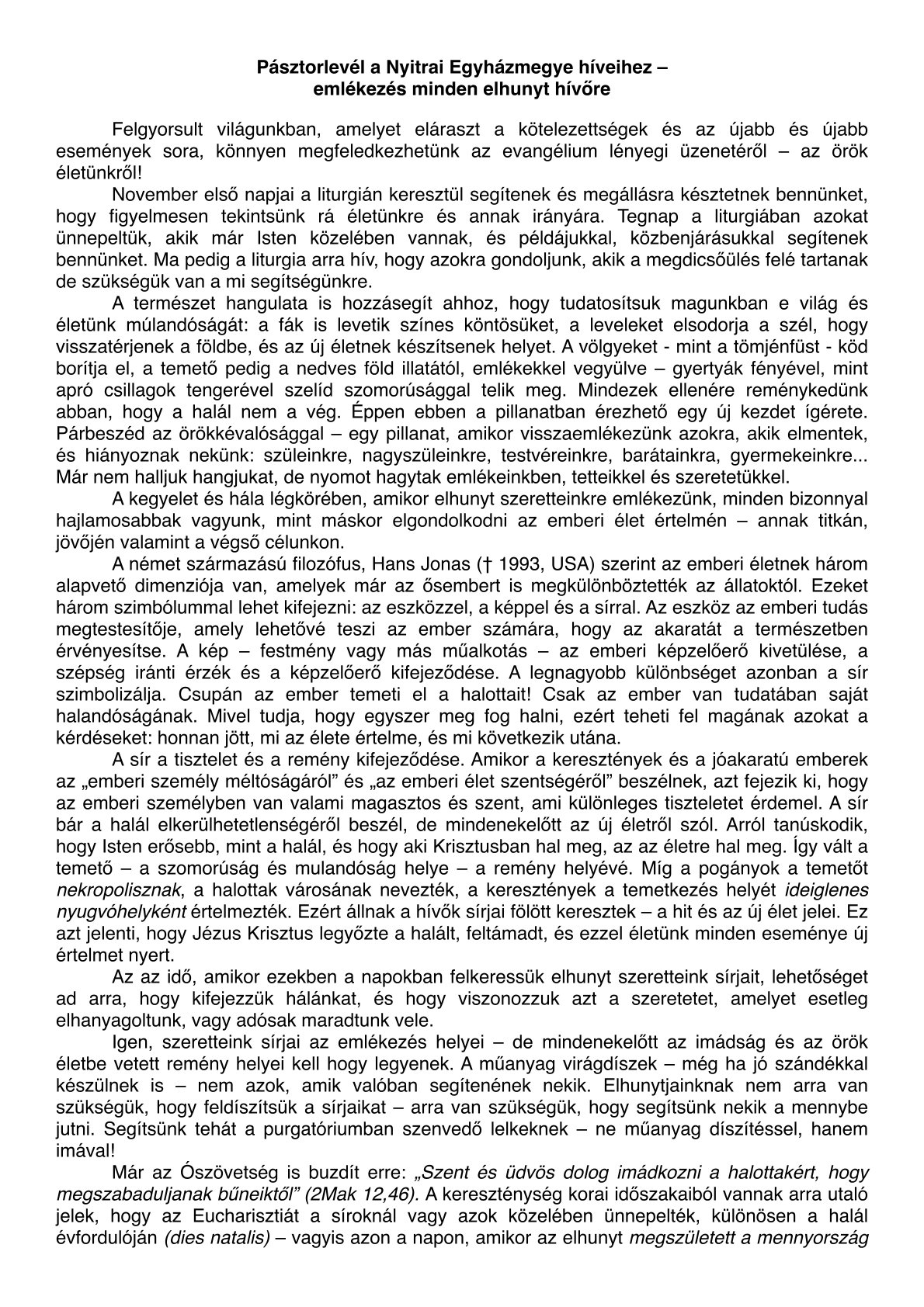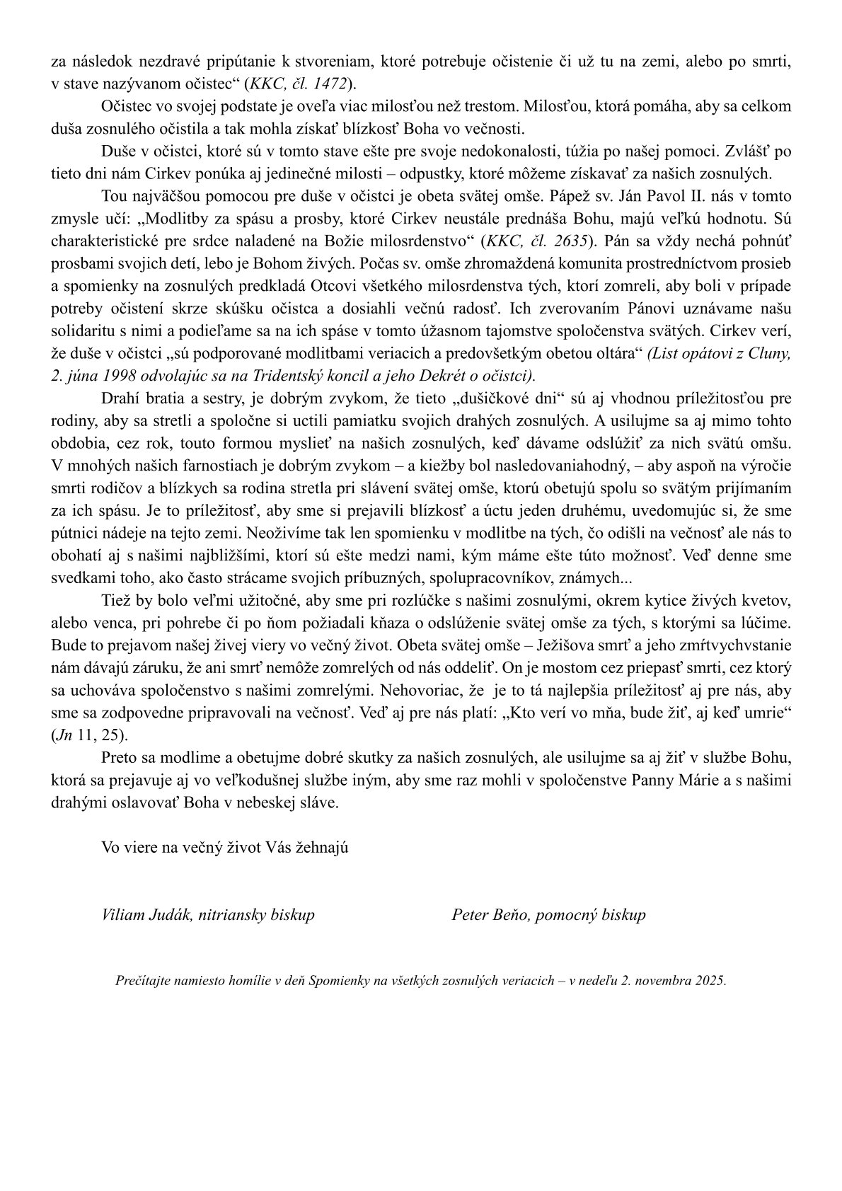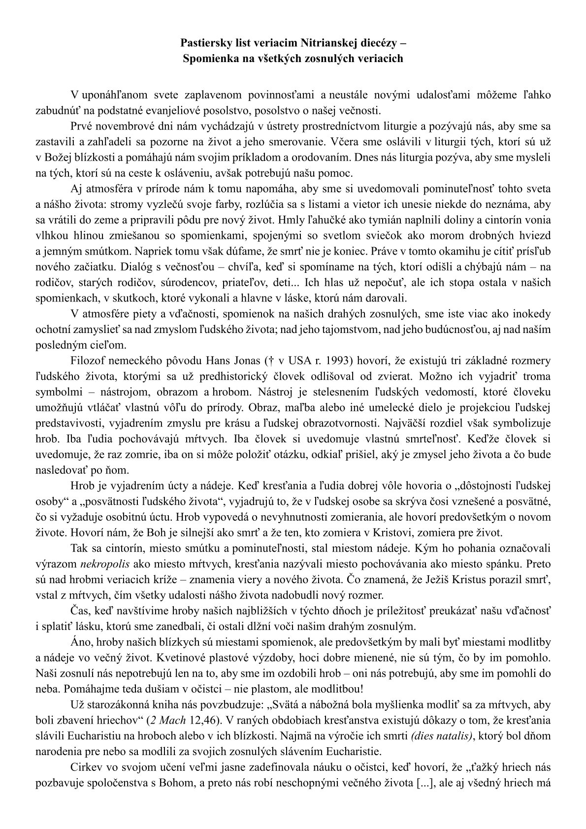 Na Spomienku na všetkých zosnulých veriacich napísali nitriansky biskup Mons. Viliam Judák a pomocný nitriansky biskup Mons. Peter Beňo veriacim Nitrianskej diecézy pastiersky list, ktorý prinášame v plnom znení a v prílohe aj v maďarskom jazyku: