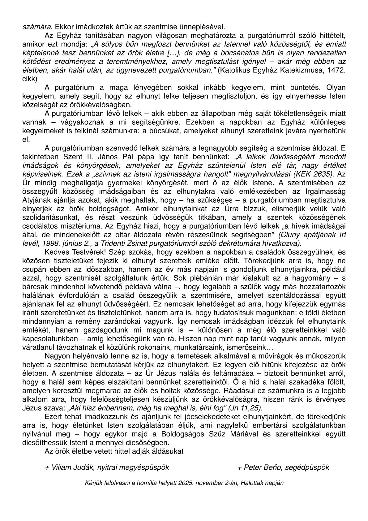 V uponáhľanom svete zaplavenom povinnosťami a neustále novými udalosťami môžeme ľahko zabudnúť na podstatné evanjeliové posolstvo, posolstvo o našej večnosti. Prvé novembrové dni nám vychádzajú v ústrety prostredníctvom liturgie a pozývajú nás, aby sme sa zastavili a zahľadeli sa pozorne na život a jeho smerovanie. Včera sme oslávili v liturgii tých, ktorí sú už v Božej blízkosti a pomáhajú nám svojim príkladom a orodovaním. Dnes nás liturgia pozýva, aby sme mysleli na tých, ktorí sú na ceste k osláveniu, avšak potrebujú našu pomoc.