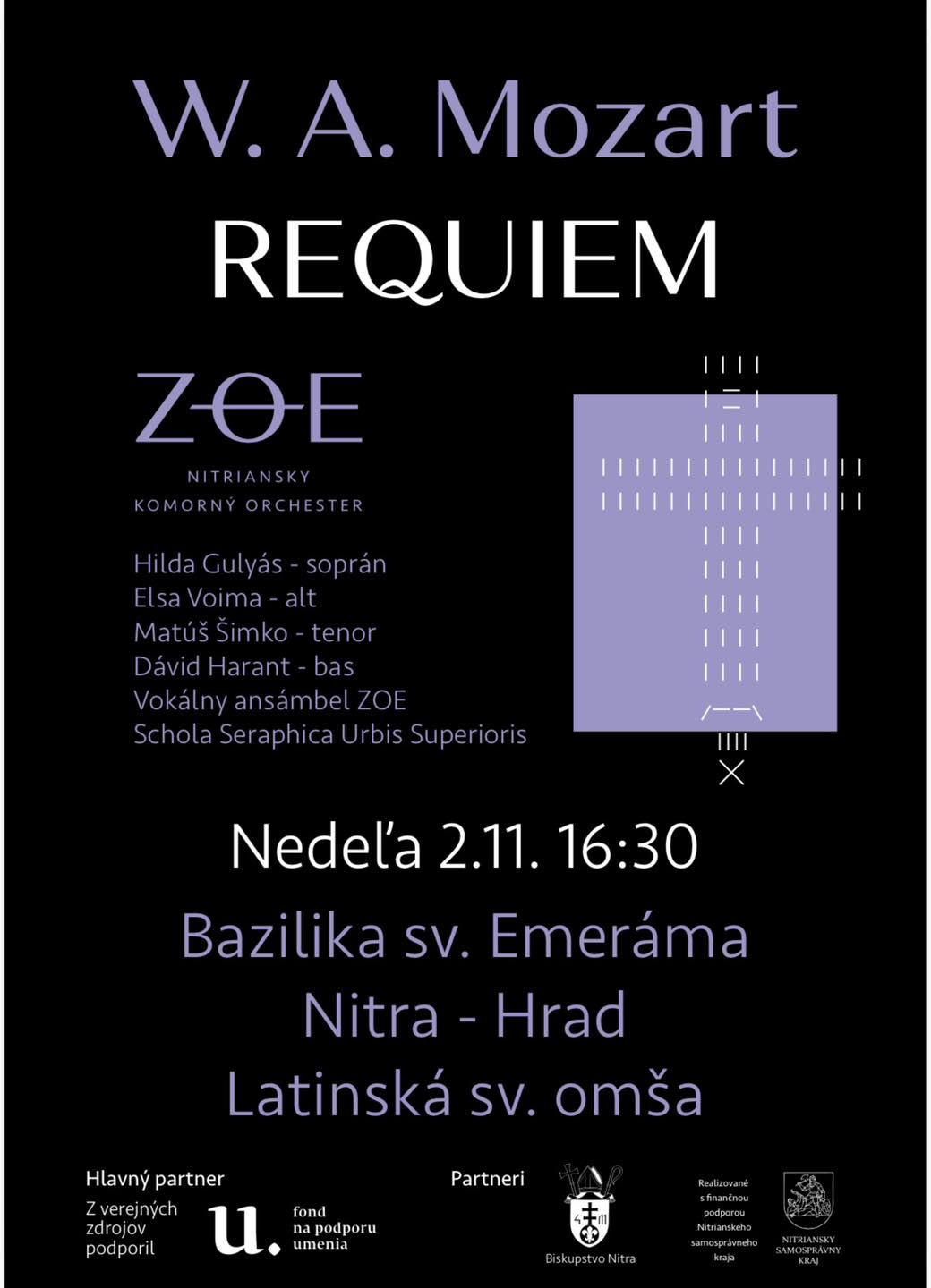 V nedeľu 2. novembra 2025 o 16,30 hod. sa v Bazilike sv. Emeráma na Nitrianskom hrade bude sláviť aj latinská svätá omša za zosnulých s „Requiem“ od W.A. Mozarta. Hlavný celebrantom bude tajomník nitrianskeho biskupa Vdp. Dominik Ondriaš. Hudobný sprievod bude mať Nitriansky komorný orchester ZOE a Schola Seraphica Urbis Superioris. Všetci sú srdečne vítaní!
