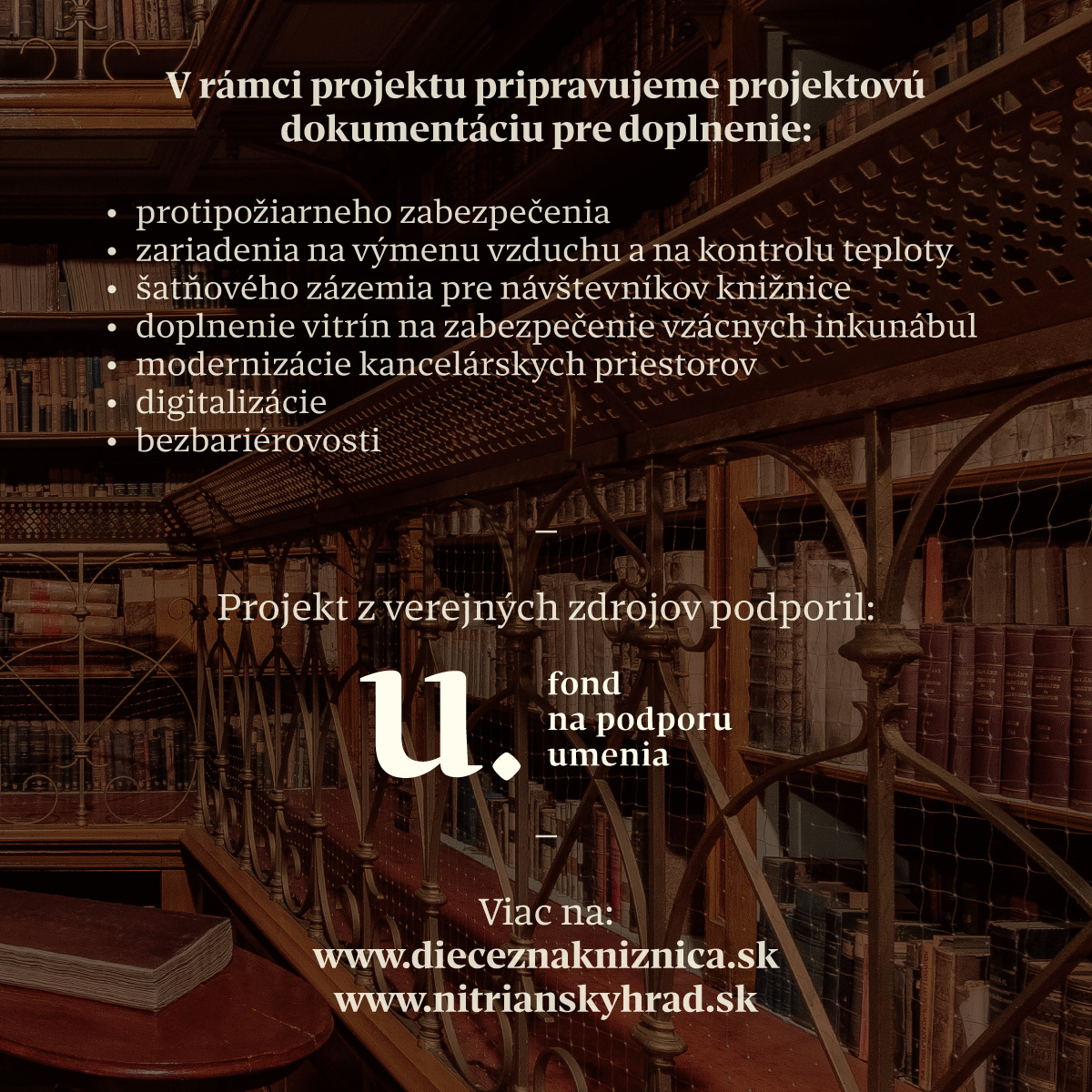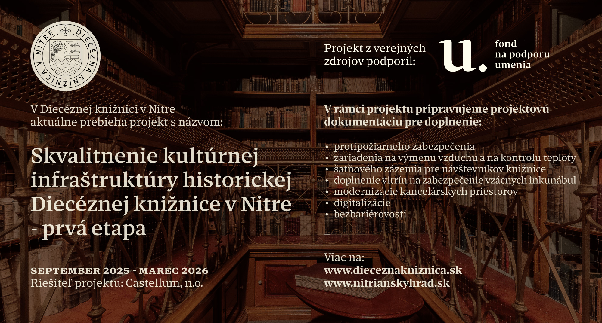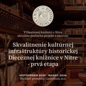 Castellum n.o. v mesiacoch september 2025 – marec 2026 realizuje I. etapu projektu pod názvom „Skvalitnenie infraštruktúry historickej diecéznej knižnice v Nitre. Realizácia projektu umožní modernizáciu protipožiarneho zabezpečenia, zariadenia na výmenu vzduchu a na kontrolu teploty, vybudovanie zázemia pre návštevníkov knižnice, umiestnenie vitrín na zabezpečenie vzácnych inkunábul, modernizáciu kancelárskych priestorov, digitalizáciu knižných fondov a písomností, ako aj bezbariérovosť. Realizáciou projektu Castellum n.o. vytvorí moderné podmienky pre fungovanie historickej knižnice tohto typu a jej sprístupneniu verejnosti vo väčšej miere, ako tomu bolo doteraz. Projekt podporil Fond na podporu umenia.
