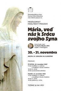Vo Farnosti Nitra – Klokočina sa v dňoch 20.-21. novembra 2025 uskutoční Medžugorský modlitbový program pod názvom „Mária veď nás k Srdcu svojho Syna“. Program bude viesť kaplán v Medžugorí Fra Marin Mikulič OFM vo farskom kostole sv. Gorazda v Nitre na Klokočine od 17,00 hod. do 19,00 hod. Všetci sú srdečne pozvaní!