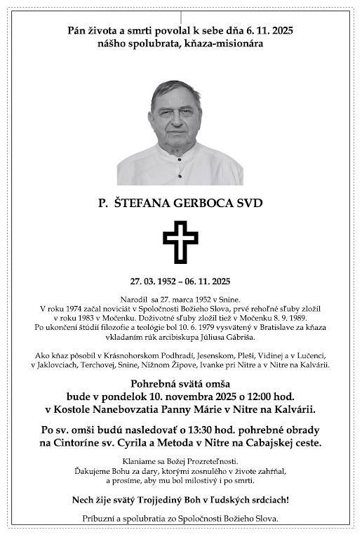 Provincialát Spoločnosti Božieho Slova v Nitre oznamuje, že 6. novembra 2025 odišiel do večnosti člen Spoločnosti Božieho Slova, P. Štefan Gerboc SVD.