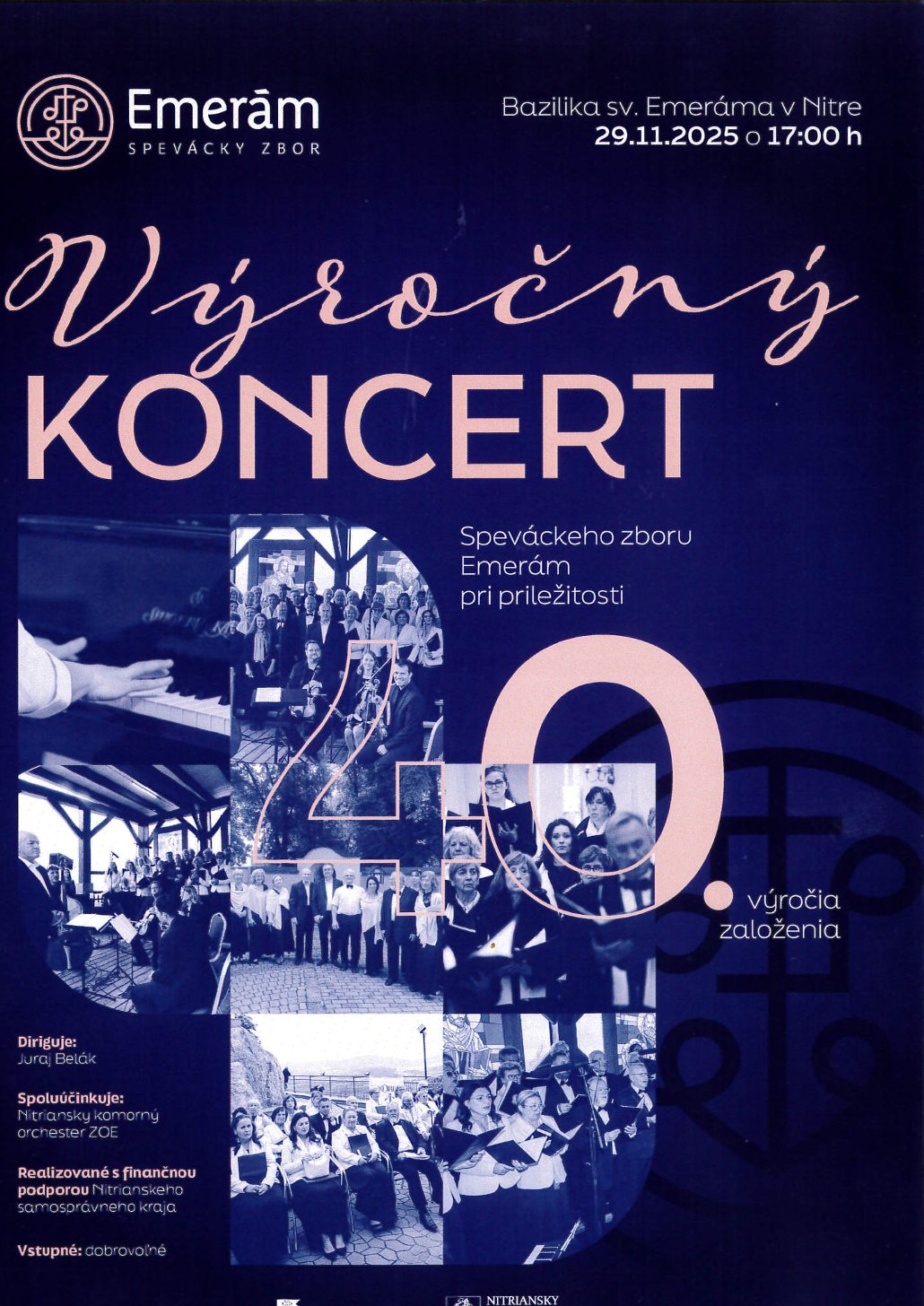 Pri príležitosti 40. výročia založenia speváckeho zboru Emerám sa dňa 29. novembra 2025 o 17,00 hod. v Katedrále – Bazilike sv. Emeráma na Nitrianskom hrade uskutoční výročný slávnostný koncert tohto zboru. V programe zaznejú skladby sakrálneho charakteru. Diriguje Juraj Belák. Spoluúčinkuje Nitriansky komorný orchester ZOE. Vstupné dobrovoľné. Všetci sú srdečne vítaní!