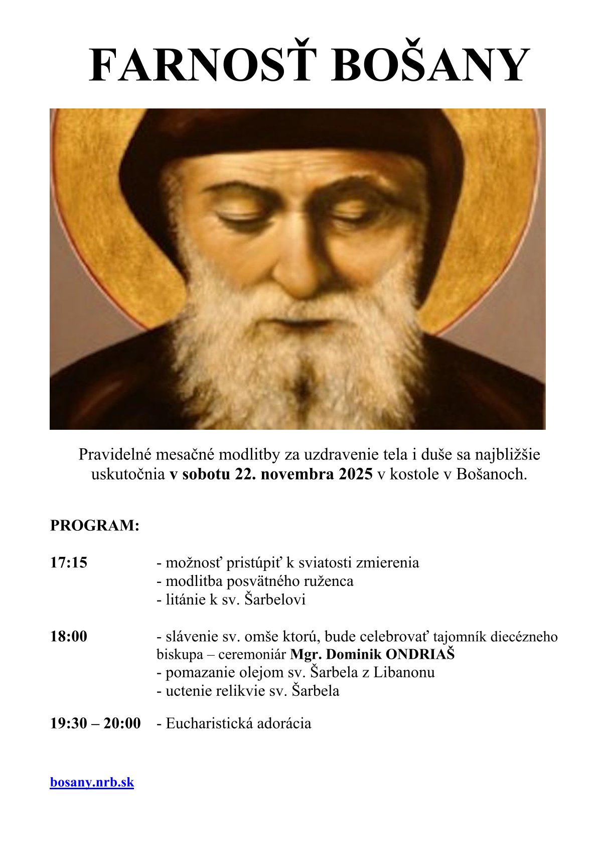 Farnosť sv. Martina z Tours v Bošanoch pozýva veriacich na pravidelné mesačné modlitby za uzdravenie a oslobodenie, ktoré sa najbližšie uskutočnia v sobotu 22. novembra 2025 v miestnom farskom Kostole sv. Martina z Tours v Bošanoch so začiatkom o 17,15 hod. V rámci programu je možné od 17,15 hod pristúpiť k sviatosti zmierenia. O 17,20 bude modlitba posvätného ruženca a litánie k sv. Šarbelovi. O 18,00 hod. bude slávená sv. omša spojená s pomazaním olejom sv. Šarbela z Libanonu a uctením relikvie sv. Šarbela. Hlavným celebrantom svätej omše bude tajomník diecézneho biskupa – ceremoniár Mgr. Dominik ONDRIAŠ. Po skončení svätej omše bude Eucharistická adorácia.