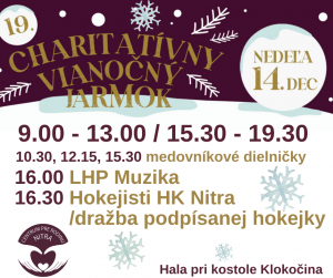 Centrum pre rodinu Nitra pozýva všetkých ľudí dobrej vôle v nedeľu 14.12. navštíviť 19. ročník Vianočného charitatívneho jarmoku s mottom „Veselého darcu Boh miluje“ organizovaného za účelom podpory viac ako 60 rodín v náročných životných situáciách z Nitry a okolia. Pestrú ponuku v 14  dobročinných stánkoch ako aj benefičný program zabezpečujú rodinné a rehoľné spoločenstvá  spriaznené s CPR, LHP muzika i niekoľko hokejistov z HK Nitra.