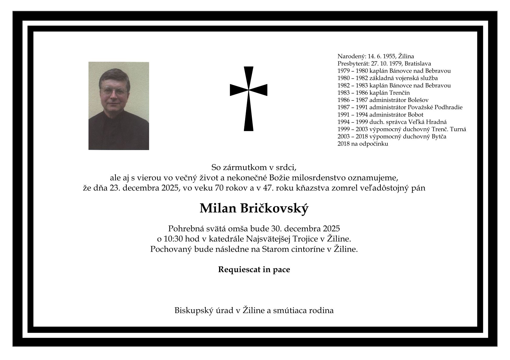 So zármutkom v srdci, ale aj s vierou vo večný život a nekonečné Božie milosrdenstvo oznamujeme, že dňa 23. decembra 2025, vo veku 70 rokov a v 47. roku kňazstva zomrel veľadôstojný pán Milan Bričkovský, kňaz Žilinskej diecézy a pôvodne pôsobiaci aj vo farnostiach Nitrianskej diecézy. Pohrebná svätá omša bude v utorok 30. decembra 2025 o 10,30 hod. v Katedrále Najsvätejšej Trojice v Žiline. Pochovaný bude následne na Starom cintoríne v Žiline. Requiescat in pace