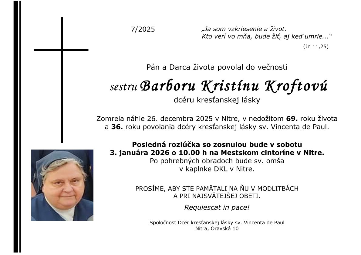 Pán a Darca života povolal do večnosti sestru Barboru Kristínu Kroftovú, DKL. Zomrela náhle 26. decembra 2025 v Nitre, v nedožitom 69. roku života a 36. roku povolania dcéry kresťanskej lásky sv. Vincenta de Paul. Posledná rozlúčka so zosnulou bude v sobotu 3. januára 2026 o 10.00 h na Mestskom cintoríne v Nitre. Po pohrebných obradoch bude sv. omša v kaplnke DKL v Nitre. Nitrianske biskupstvo ďakuje Bohu a sestre Barbore za jej obetavú službu v prospech trpiacich a zomierajúcich v Hospici u Bernadetky v Nitre. R.I.P.