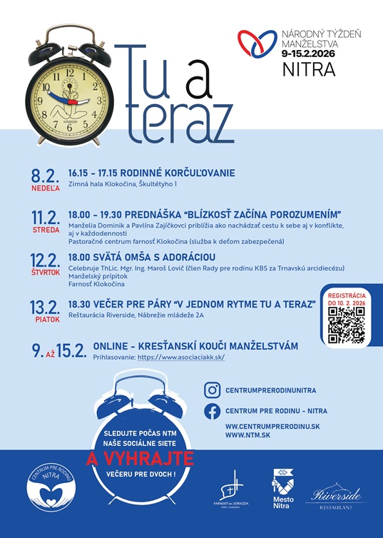 Centrum pre rodinu pozýva na podujatia v rámci  Národného týždňa manželstva 2026 s mottom Tu a teraz. Manželstvo sa neodohráva včera ani zajtra – žije sa TU a TERAZ. Nie iba v spomienkach na svadobný deň, nie len v plánoch na dovolenku o pol roka – ale i v tom, ako sa na seba pozrieme, ako si povieme „ďakujem“, v každodennom objatí, v pohladení, či obyčajnej šálke čaju pri kuchynskom stole. Predstavujeme nitriansku ponuku na prežitie Národného týždňa manželstva. Veríme, že si vyberiete, srdečne pozývame!