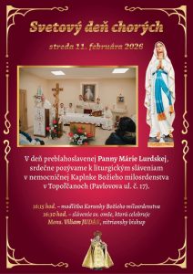 Pri príležitosti 30. svetového dňa chorých bude v stredu 11. februára 2026, kedy je liturgická spomienka preblahoslavenej Panny Márie Lurdskej, celebrovať nitriansky biskup Mons. Viliam Judák sv. omšu za chorých aj v nemocničnej kaplnke Božieho milosrdenstva v Topoľčanoch. Srdečne pozývame záujemcov k tomuto sláveniu!