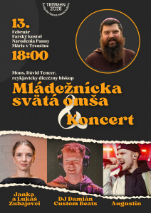 Farnosť Trenčín v spolupráci s mestom Trenčín v rámci programu otváracieho víkendu Európskeho hlavného mesta kultúry Trenčín 2026, pozýva záujemcov 13. februára 2026 o 18,00 hod na slávnostnú mládežnícku svätú omšu do Farského kostola Narodenia Panny Márie v Trenčíne pod hradom. Hlavným celebrantom bude Mons. Dávid Tencer, biskup v Reykjavíku (Island). Počas svätej omše budú spievať Janka a Lukáš Zubajovci. Hneď po svätej omši bude nasledovať koncert Janky a Lukáša Zubajovcov, DJ Damiána Custom Beats a rapera Martina „Augustína“ Dvornického. Vstup je voľný.