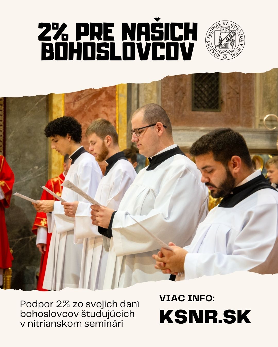 Aj tento rok môžete svojimi 2 % pomôcť formácii budúcich kňazov v Kňazskom seminári sv. Gorazda v Nitre. Aktuálne sa v ňom vzdelávajú budúci kňazi z piatich diecéz: nitrianska, bratislavská, trnavská, žilinská a banskobystrická. Novinka – od roku 2026 môžete poukázať 2 % aj svojim rodičom – dôchodcom a zároveň podporiť neziskovú organizáciu. Tlačivo nájdete na našom webe: ksnr.sk  Ďakujeme za vašu podporu, štedrosť a modlitby.