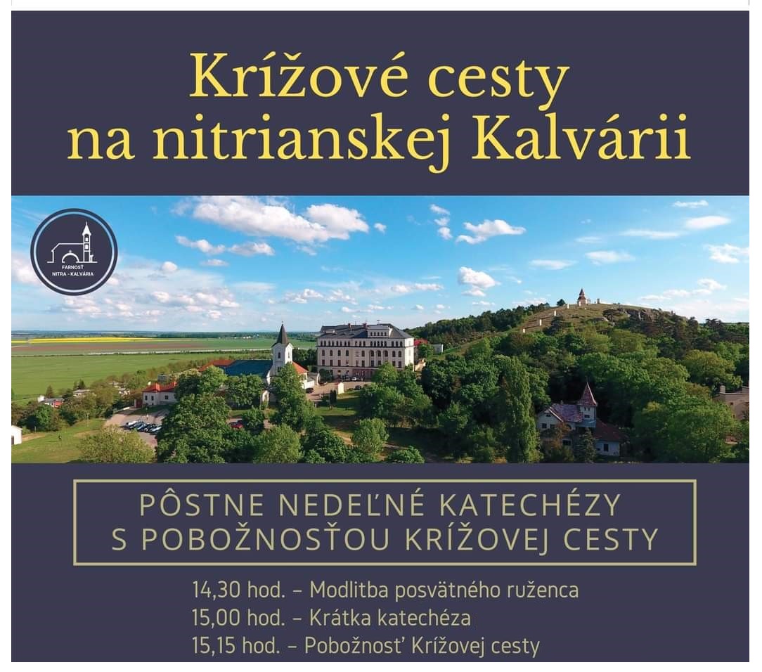 Aj počas tohtoročného pôstneho obdobia sa vďaka pátrom Verbistom zo Spoločnosti Božieho Slova budú konať už tradičné pobožnosti Krížovej cesty na nitrianskej Kalvárii. Budú sa konať každú pôstnu nedeľu so začiatkom o 14,30 hod. v Kostole Nanebovzatia Panny Márie. Súčasťou programu bude vždy aj modlitba posvätného ruženca a pôstna katechéza. Všetci veriaci zvlášť z nitrianskych mestských farností a blízkeho okolia sú srdečne pozvaní.