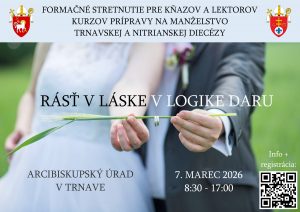 KBS v decembri 2025 schválila Pastoračné usmernenie k príprave na sviatosť manželstva. Kvôli lepšiemu porozumeniu i praktickému využitiu usmernenia aj novej metodiky KPM (Kurzu prípravy na manželstvo) s názvom „Rásť v láske v logike daru“, sa uskutoční stretnutie súčasných i pre túto službu nádejných kňazov a lektorov, manželských párov Nitrianskej a Trnavskej diecézy. Podujatie sa koná v sobotu 7. marca 2026 v TRNAVE od 8.30 do cca 17.00 hod. Obed i občerstvenie sú zabezpečené. Je potrebné sa zaregistrovať do 1.3.2026 cez link, alebo qr kód na plagáte. Nech sa páči link s programom a prihláškou: Registrácia a info stretnutie Trnava 7.3.  Rásť v láske v logike daru – Trnava 7. 3. 2026