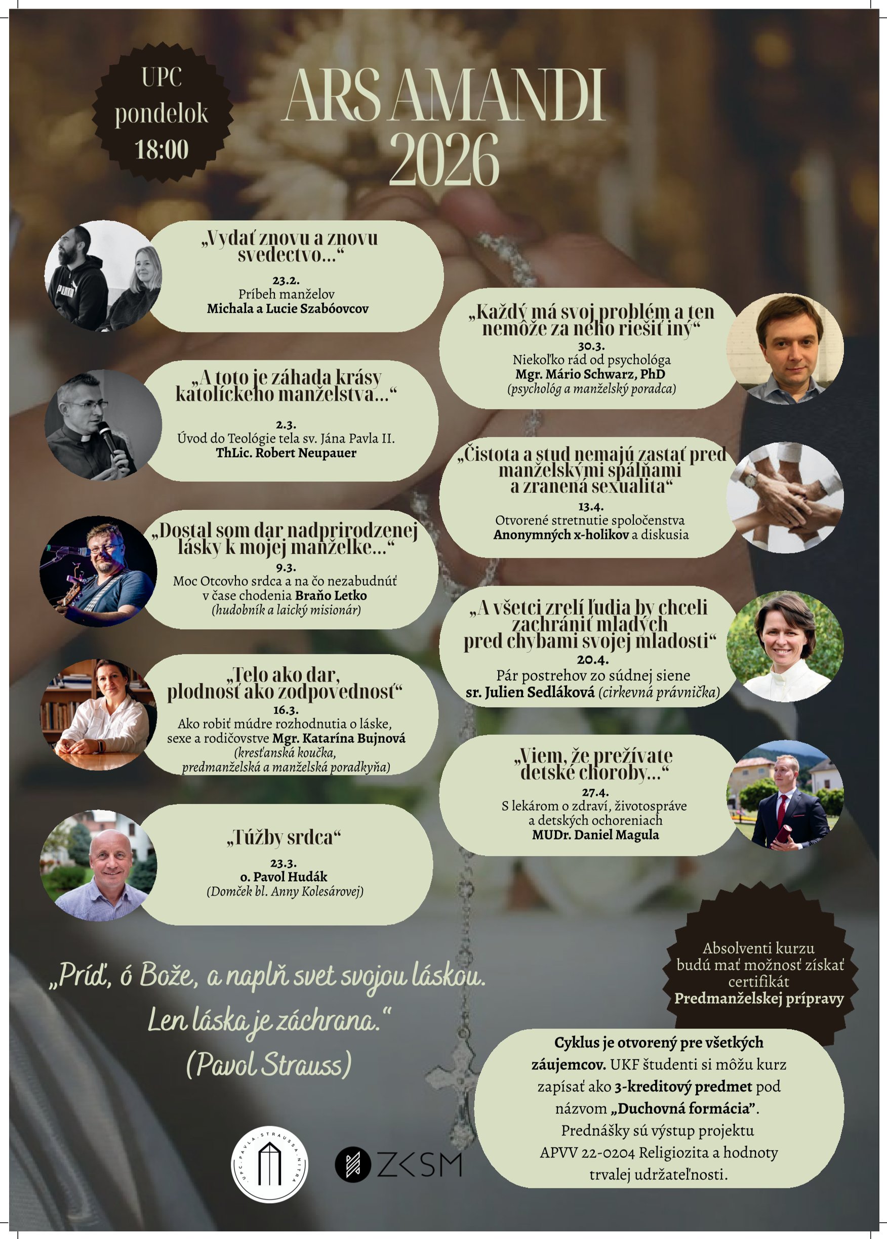 V UPC Pavla Straussa v Nitre sa vo februári začal semestrálny kurz Ars Amandi 2026, ktorý je otvorený pre všetkých záujemcov – študentov i neštudentov, zadaných i slobodných. po jeho absolvovaní e možné získať certifikát o ukončení (osvedčenie o absolvovaní predmanželskej prípravy). Kurz a jeho prednáškový cyklus prebieha každý pondelok  o 18,00 hod.  Študenti z UKF majú zároveň aj jedinečnú príležitosť zapísať si tento kurz ako Cčkový predmet, a získať 3 easy kredity a pritom zaujímavé informácie do života. Sdrdečne pozývame!