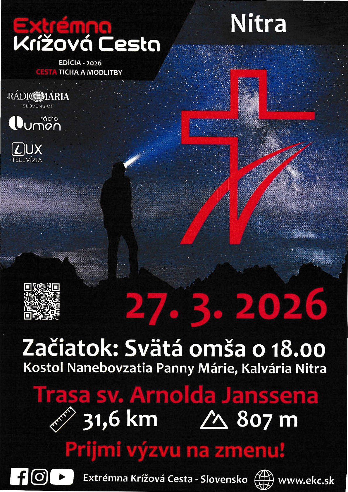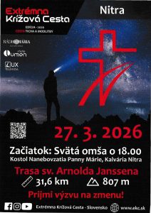 Pozývame záujemcov na celonočnú Extrémnu Krížovú cestu, ktorá sa uskutoční v piatok 27. marca 2026 v Nitre. Putovanie sa začne svätou omšou o 18,00 hod. v Kostole Nanebovzatia Panny Márie na Kalvárii. Odtiaľ trasa povedie cez Zobor a Podhorany ku Kostolu sv. Michala v Dražovciach, ďalej ku Kláštoru ružových sestier na Šindolke a bude ukončená opäť na Kalvárii v Nitre. Okruh má 30km a putuje sa individuálne, v tichu a za každého počasia. Extrémna Krížová cesta nie je o výkone. Je to priestor, kde sa Pán dotýka našich sŕdc – v tichu, námahe a dôvere. Ak cítite túžbu precítiť prítomnosť Otca a nájsť v tom silu v náročných chviľach, registrujte sa na ekb.sk. Registrácia je potrebná, aby sme mohli pre každého učastníka pripraviť podrobný itinerár, texty rozjímaní a ďalšie potrebné materiály.