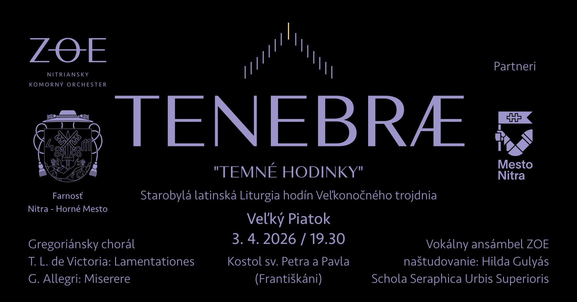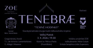 Na Veľký piatok 3. apríla 2026 sa v Kostole sv. Petra a Pavla – Františkáni o 19,30 hod. uskutoční starobylá latinská Liturgia hodín Veľkonočného trojdnia „Tenebrae – Temné hodinky“. Účinkuje vokálny zbor Nitrianskeho komorného orchestra ZOE pod vedením zbormajsterky Hildy Gulyás, v ktorého podaní zaznie gregoriánsky chorál a skladby od T.L. de Victoria Lamentationes a G. Allegriho Miserere. Vstup je voľný. Všetci sú srdečne pozvaní!