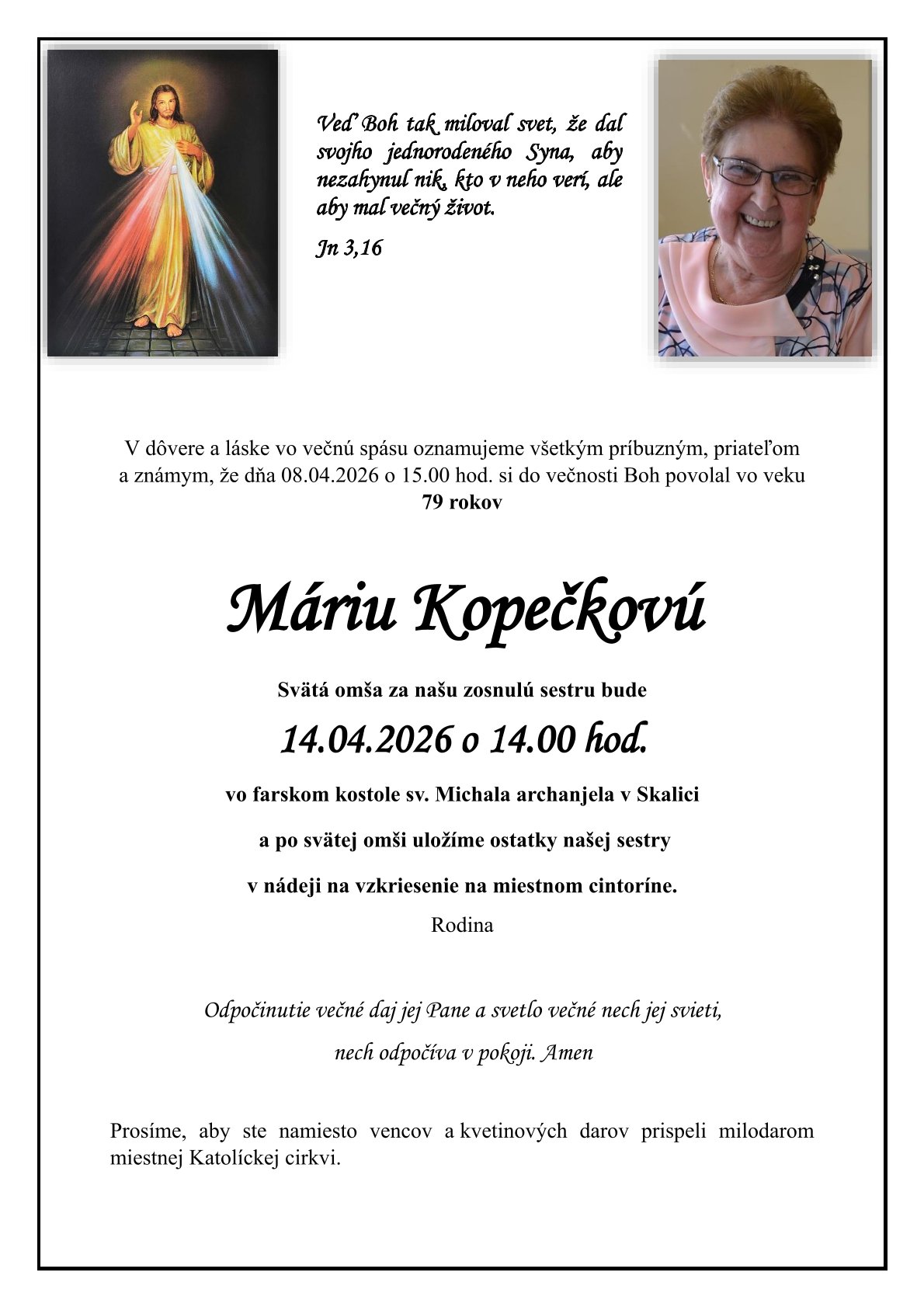V duchu kresťanskej nádeje na vzkriesenie a s prosbou o modlitbu Vám oznamujeme, že dňa 8. apríla 2026 nás vo veku 79 rokov predišla do večnosti pani Mária Kopečková, mama nášho spolubrata vdp. Petra Janíka, farára Farnosti Slatina nad Bebravou. Svätá omša spojená s pohrebnými obradmi bude v utorok 14. apríla 2026 o 14:00 hod. vo Farskom kostole sv. Michala, archanjela v Skalici. Po svätej omši bude telo zosnulej uložené v nádeji na vzkriesenie na miestnom cintoríne. R. I. P.