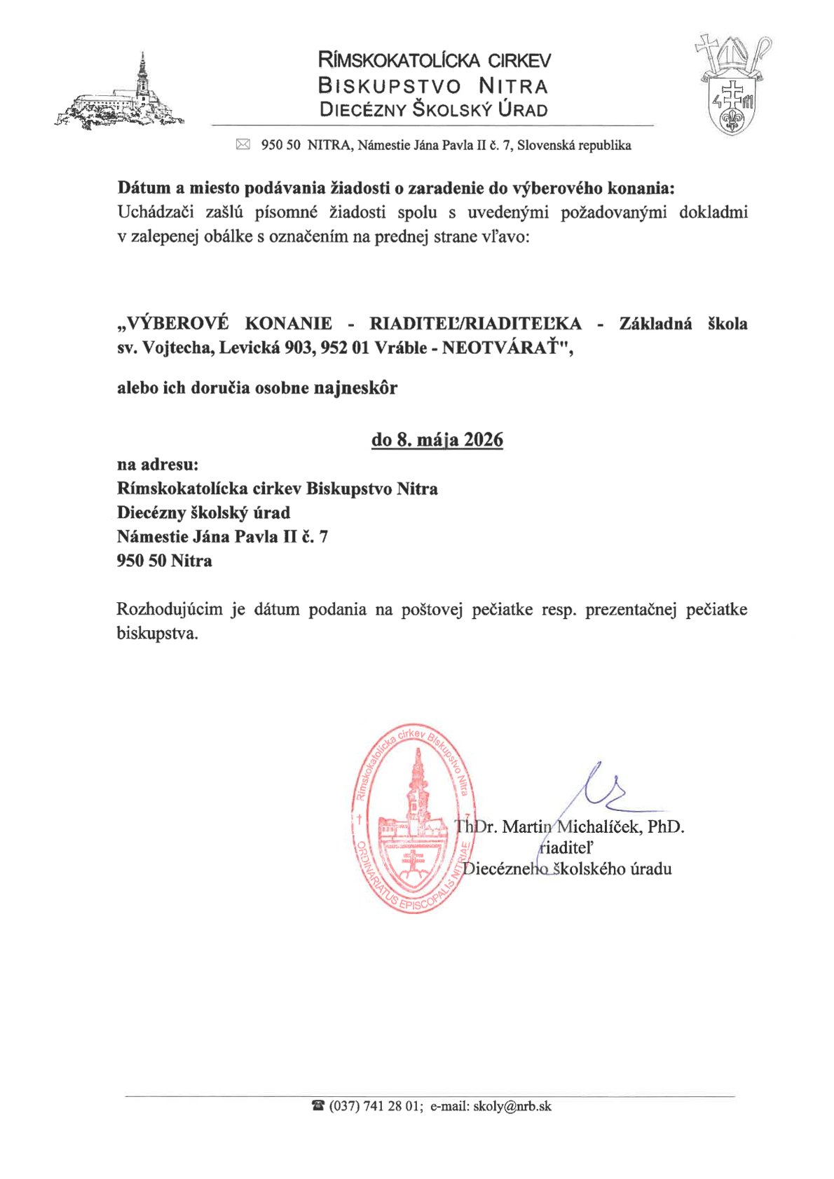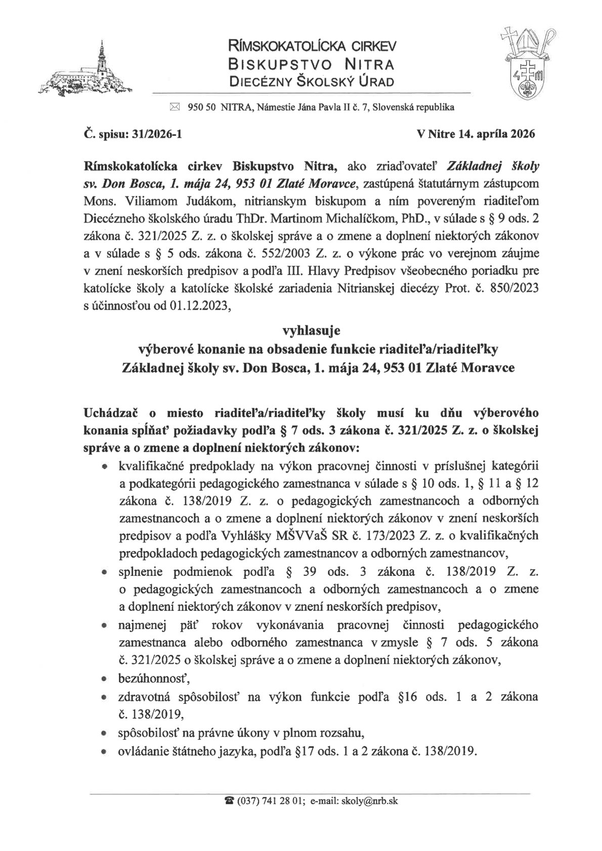 Rímskokatolícka cirkev Biskupstvo Nitra, ako zriaďovateľ Základnej školy sv. Vojtecha, Levická 903, 952 01 Vráble a Základnej školy  sv. Don Bosca, 1. mája 24, 953 01 Zlaté Moravce, zastúpená štatutárnym zástupcom Mons. Viliamom Judákom, nitrianskym biskupom a ním povereným riaditeľom Diecézneho školského úradu ThDr. Martinom Michalíčkom, PhD., v súlade s § 9 ods. 2 zákona č. 321/2025 Z. z. o školskej správe a o zmene a doplnení niektorých zákonov    a v súlade s § 5 ods. zákona č. 552/2003 Z. z. o výkone prác vo verejnom záujme v znení neskorších predpisov a podľa III. Hlavy Predpisov všeobecného poriadku pre katolícke školy a katolícke školské zariadenia Nitrianskej diecézy Prot. č. 850/2023 s účinnosťou od 01.12.2023,