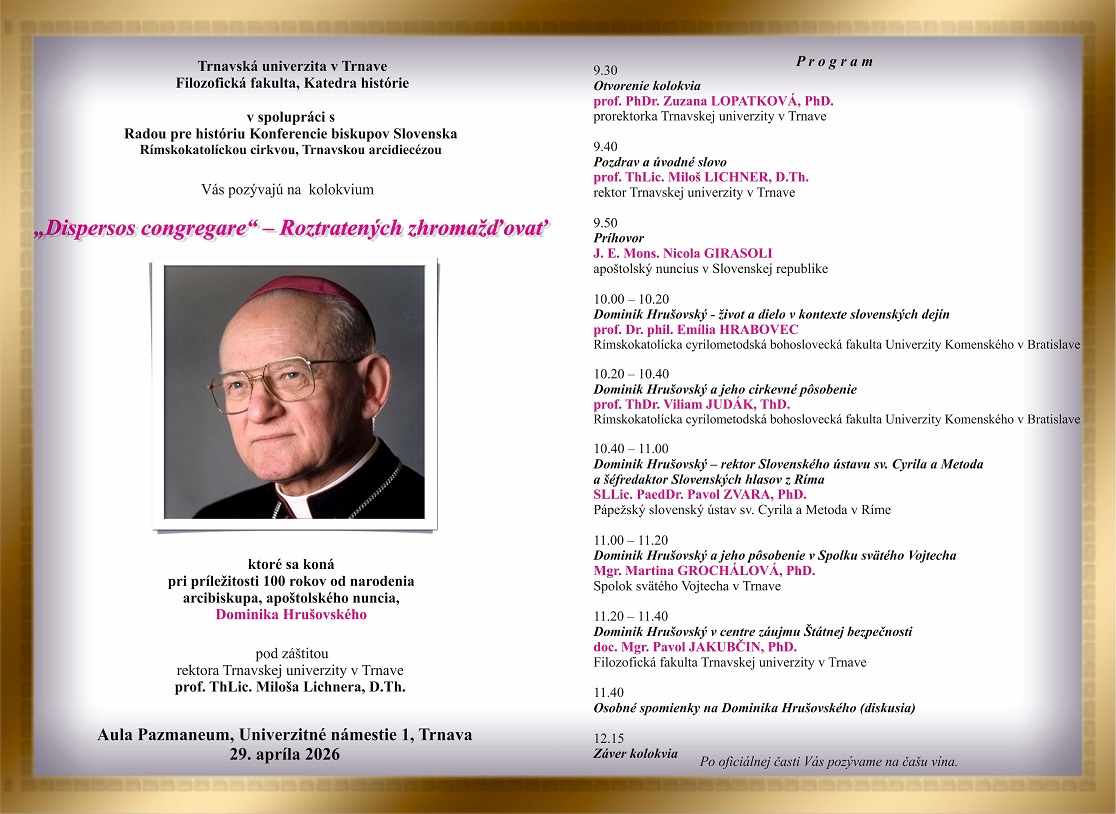 Pri príležitosti storočnice narodenia arcibiskupa a apoštolského nuncia Mons. Dominika Hrušovského, sa 29. apríla 2026 v Aule Pazmaneum Trnavskej univerzity v Trnave kolokvium pod názvom „Dispersos congregare – Roztratených zhromažďovať“.   Všetci sú srdečne pozvaní!