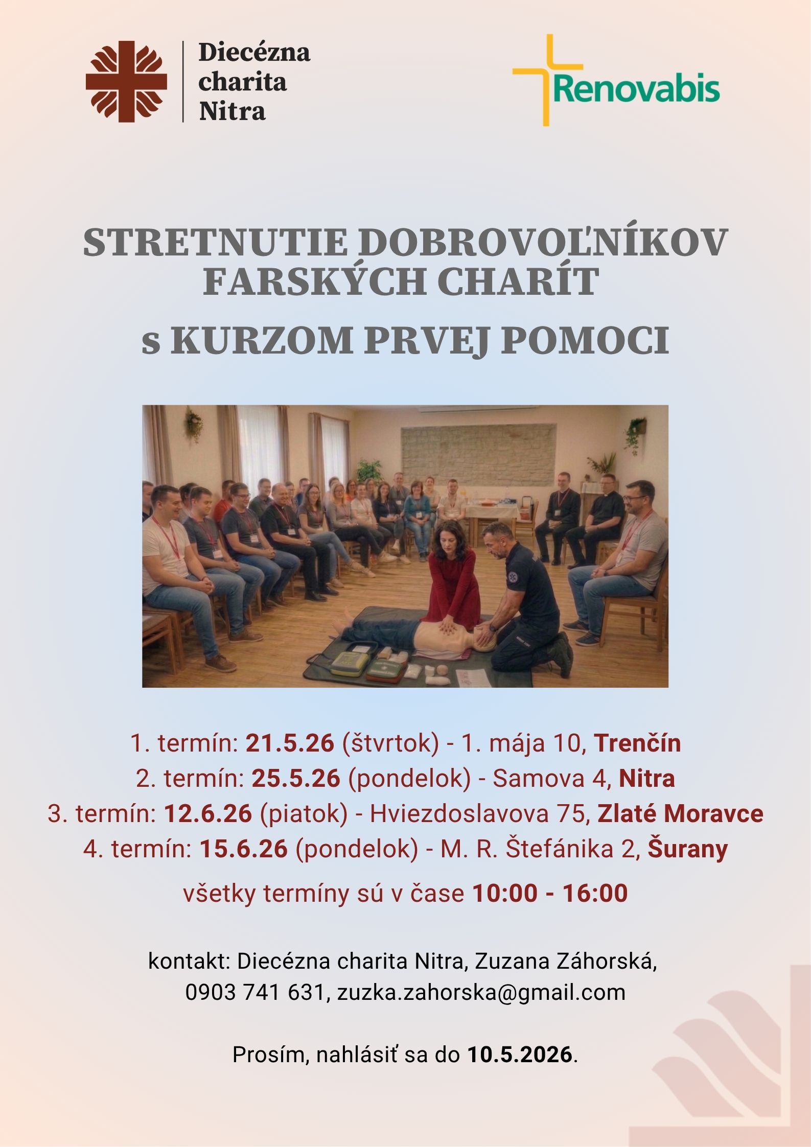 Diecézna charita v Nitre pozýva dobrovoľníkov farských charít a kňazov Nitrianskej diecézy na spoločné stretnutie spojené s kurzom prvej pomoci. Spoločným stretnutím ponúkame priestor na vzájomné spoznanie sa dobrovoľníkov farských charít a kňazov, ktorí sa zaujímajú o charitnú službu vo farnosti. Kurz prvej pomoci nám dáva návod ako prekonať strach a v kritickej situácii aktívne reagovať pri pomoci človeku v našej blízkosti. Stretnutia sú rozdelené do štyroch termínov (kvôli kurzu prvej pomoci, ktorý je ideálny pre počet cca 15 účastníkov).