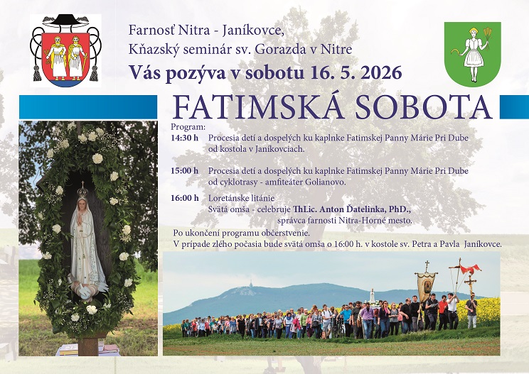 RKFÚ Nitra – Janíkovce a Kňazský seminár sv. Gorazda v Nitre pozývajú záujemcov na tradičnú mariánsku púť k Dubu pri príležitosti Fatimskej soboty, ktorá sa uskutoční 16. mája 2026 so začiatkom procesií o 14,30 hod. z Janíkoviec a Golianova. Po pešej púti k Dubu bude o 16,00 hod. pri kaplnke celebrovať slávnostnú sv. omšu  ThLic. Anton Ďatelinka, vicekancelár Biskupského úradu a správca farnosti Nitra – Horné mesto. V prípade nepriaznivého počasia sa púť uskutoční v Kostole sv. Petra a Pavla v Janíkovciach. Všetci sú srdečne pozvaní!